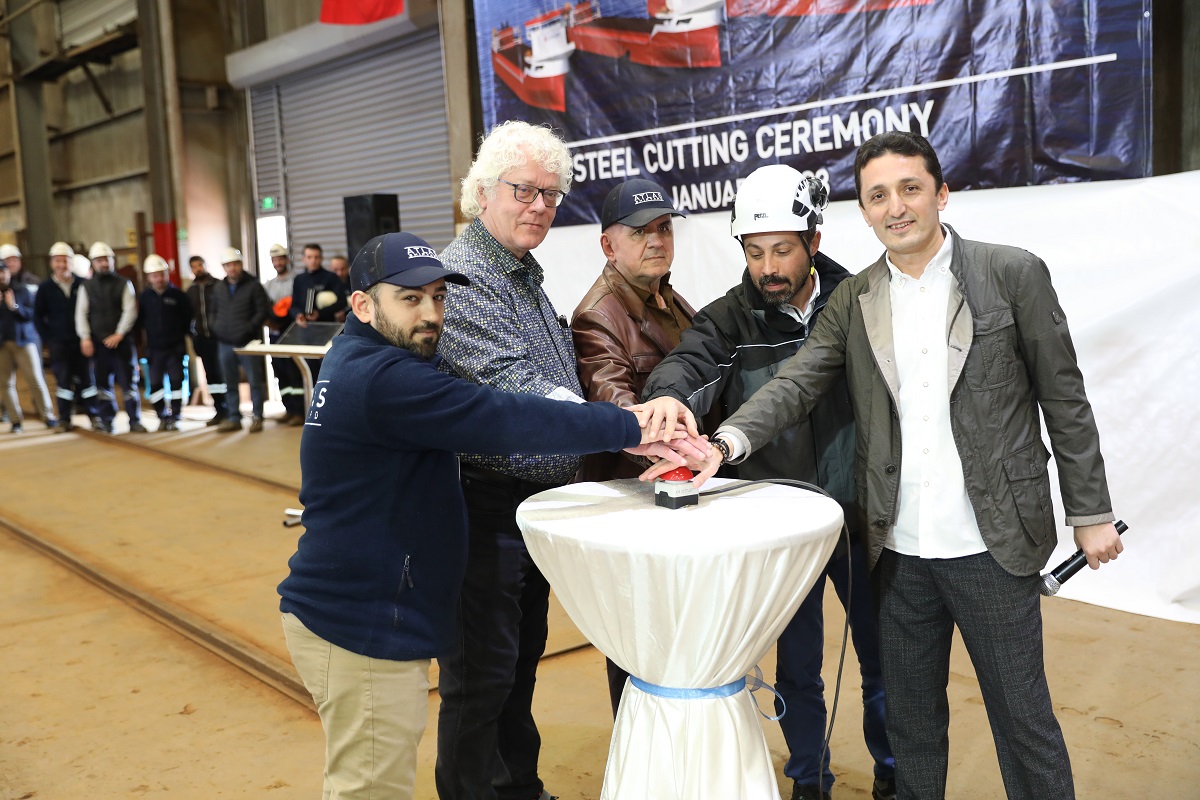 Steel Cutting Ceremony of the 1st 8.600 Dwt Dry Cargo Vessel for LONGSHIP / Netherlands, was carried out on 17th of January 2023 by the participation Owner's Representative, Mr. Sjaak Rutjes, BV and whole ATLAS team.